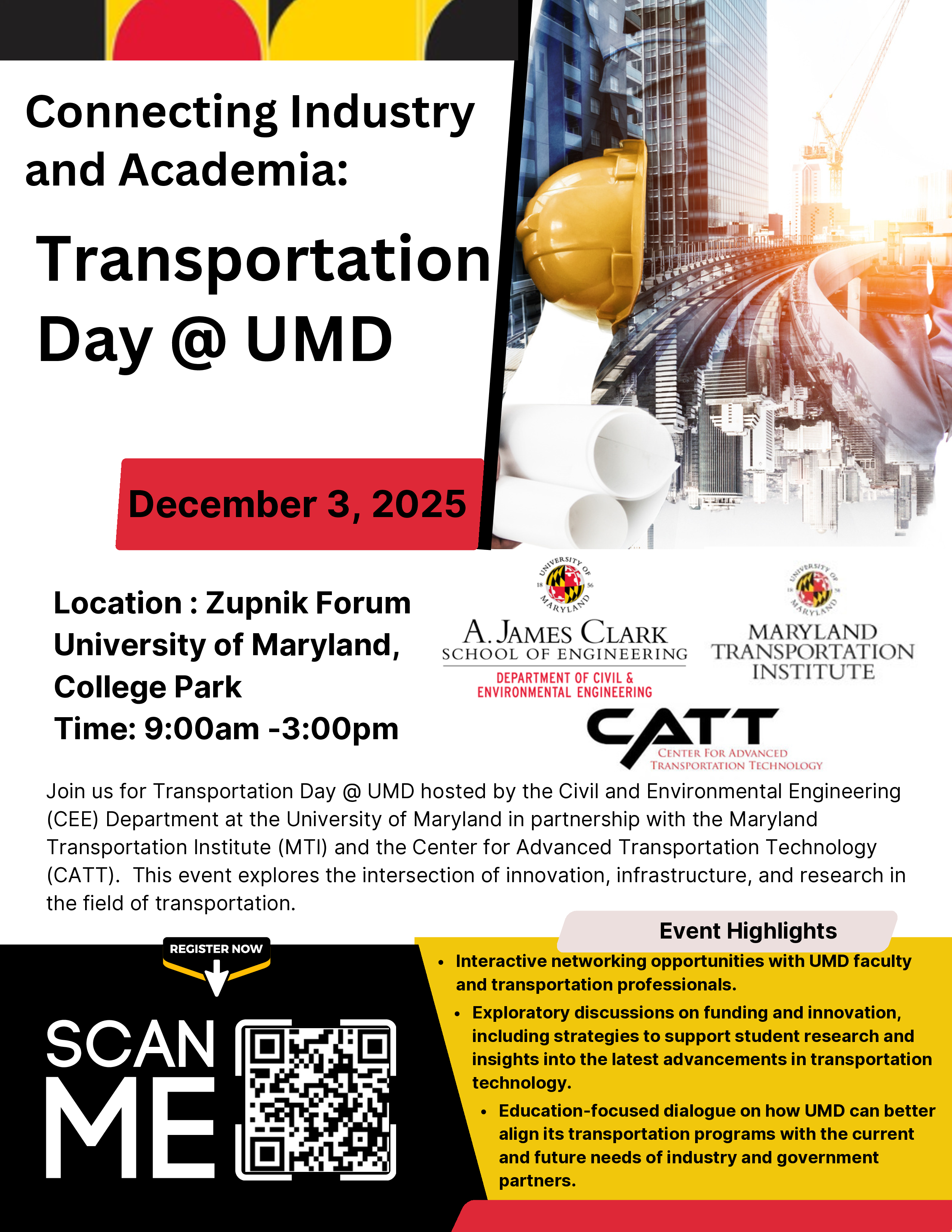 Join us for Transportation Day @ UMD, hosted by the Department of Civil and Environmental Engineering (CEE) at the University of Maryland in partnership with the Maryland Transportation Institute (MTI), and the Center for Advanced Transportation Technology (CATT). This event explores the intersection of innovation, infrastructure, and research in the field of transportation.