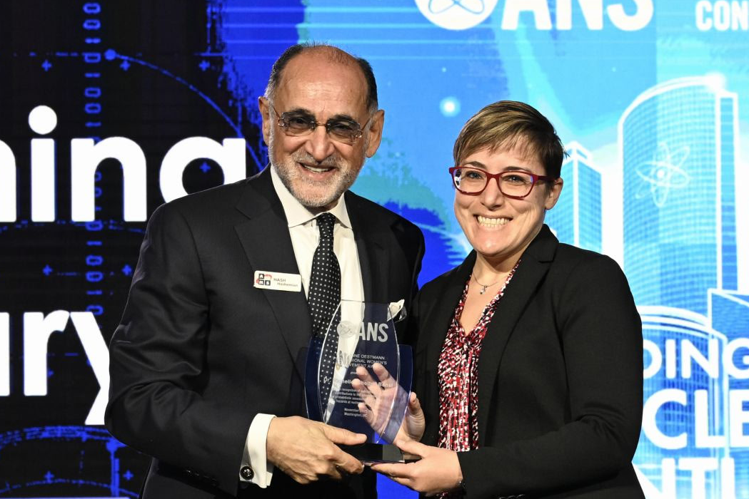 American Nuclear Society President H.M. Hashemian officially recognizes UMD Associate Professor Michelle (Shelby) Bensi with the 2025 Mary Jane Oestmann Professional Women’s Achievement Award.